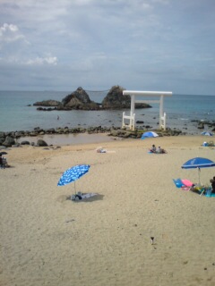 おしゃべりの合間にふと海を見ると、海中にそびえ立つ夫婦石がありました。
